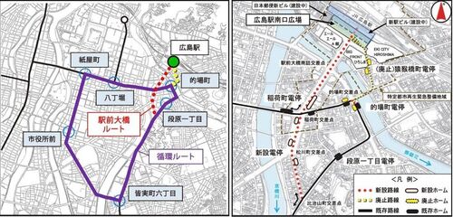 広島電鉄は、8月3日、下図(出典:広電ウェブページの広島駅南口広場再整備等について)のとおり、駅前大橋ルートの新線を開業する。 広島駅(JR広島駅2階に直結)~稲荷町~比治山町交差点間に新線を開業し、広島駅~猿猴橋町~的場町の旧ルートを廃止する…